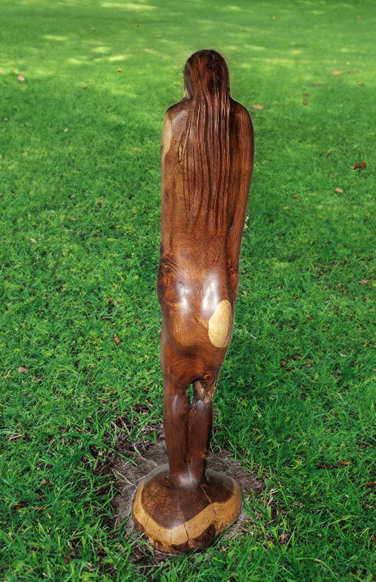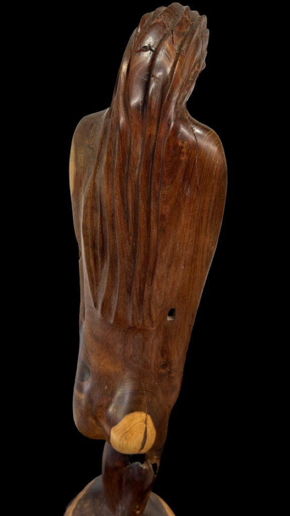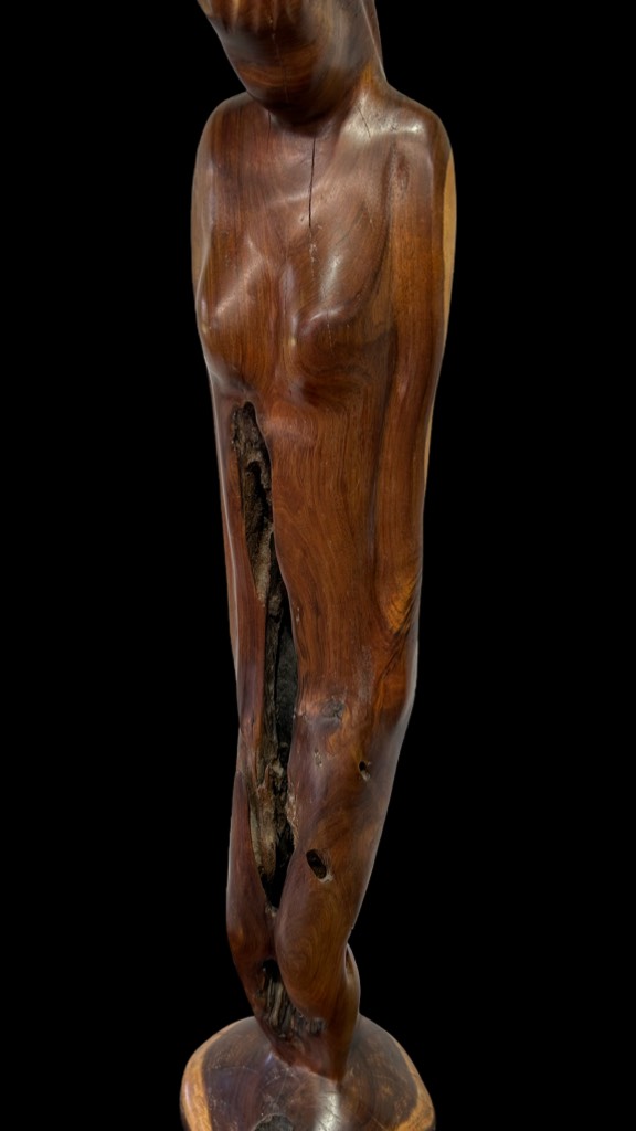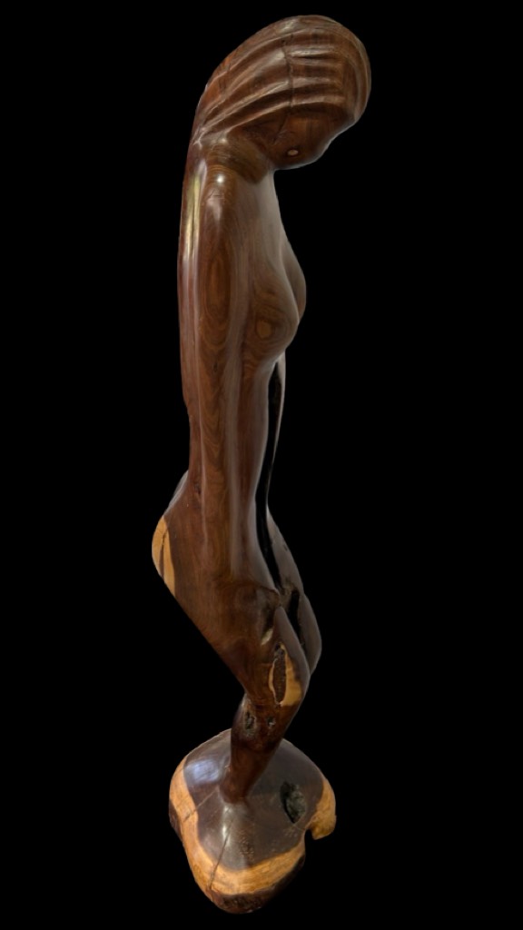 Beautiful hand-carved wooden sculpture of the female form made from beautiful Tasmanian Blackwood. Smoothly polished with natural wood grain and knots, making it completely unique. The figure’s elongated lines and bowed head convey a sense of grace, contemplation, and quiet strength. This sculpture stands about 120 cm tall and the weight is aproximately 15 Kilograms.